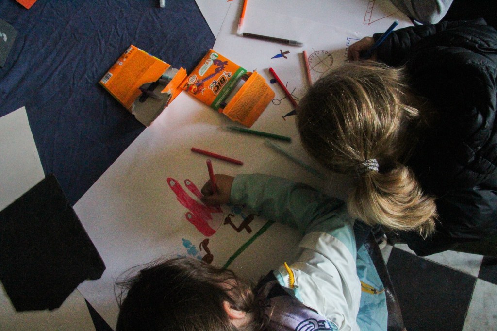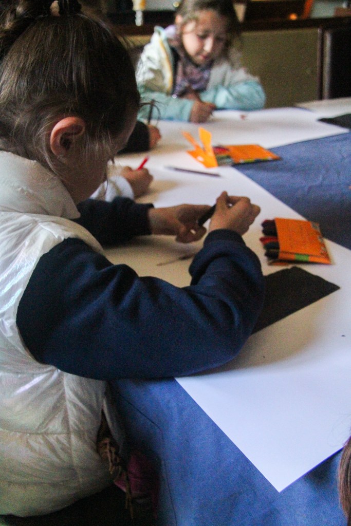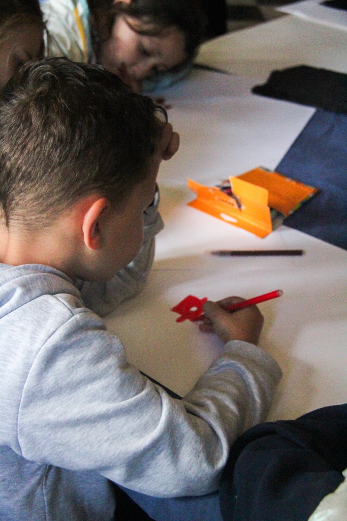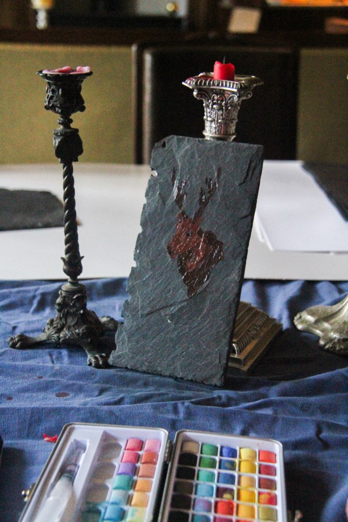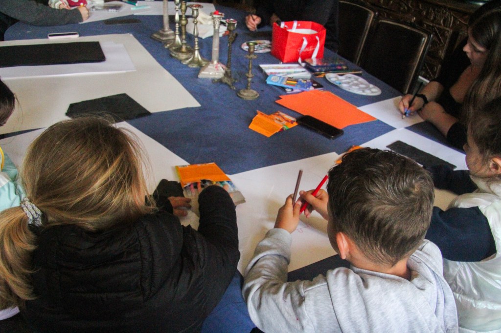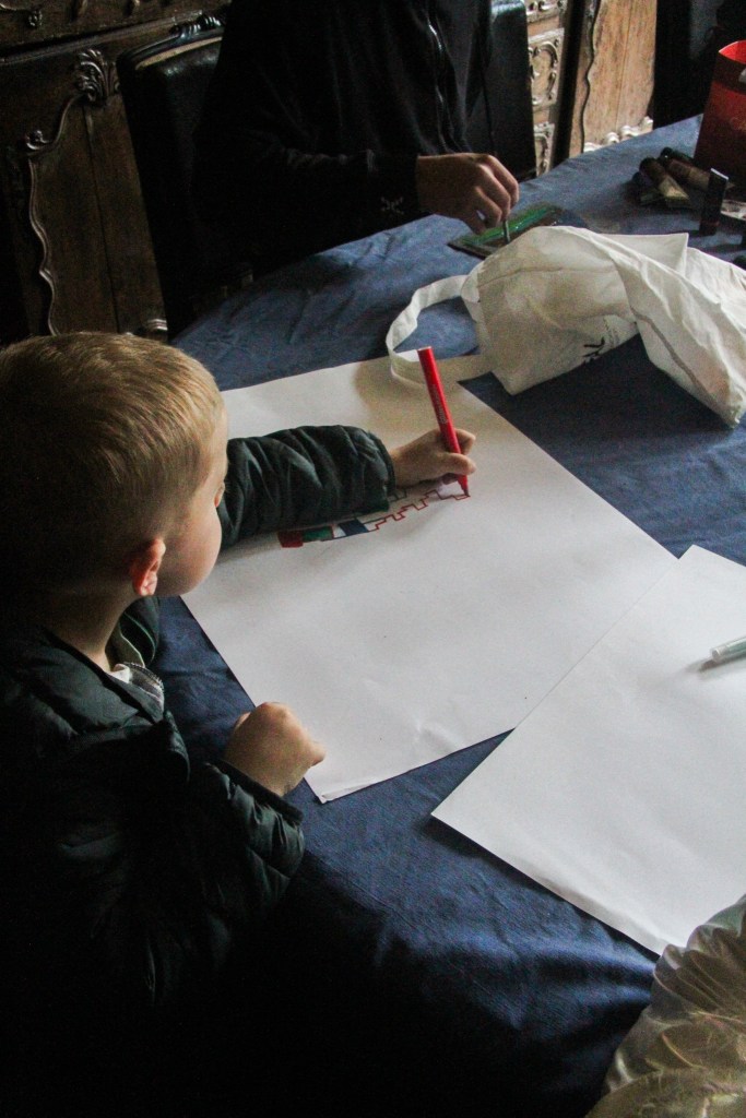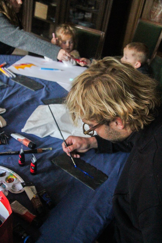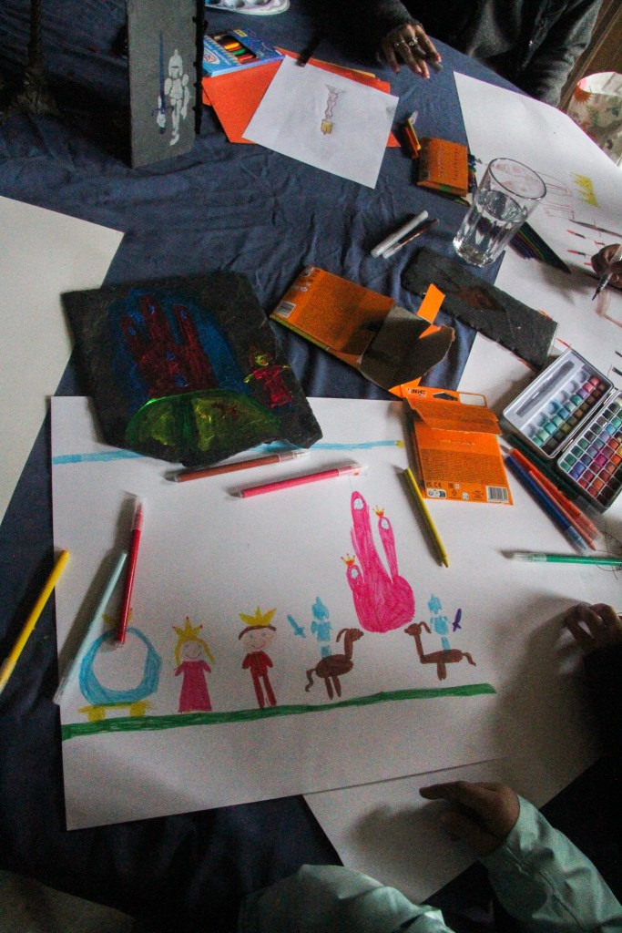 Each Kid could pick his / her own stoneplate from the Garden and the Artist Christopher von Gruben painted with them together on it. So each Kid could bring home a Memory on a own piece of the old Castle. Christopher was also amazed by the Drawing the Kids did together in the Diningroom of the Castle, inspired by his Work he has shown them earlier.